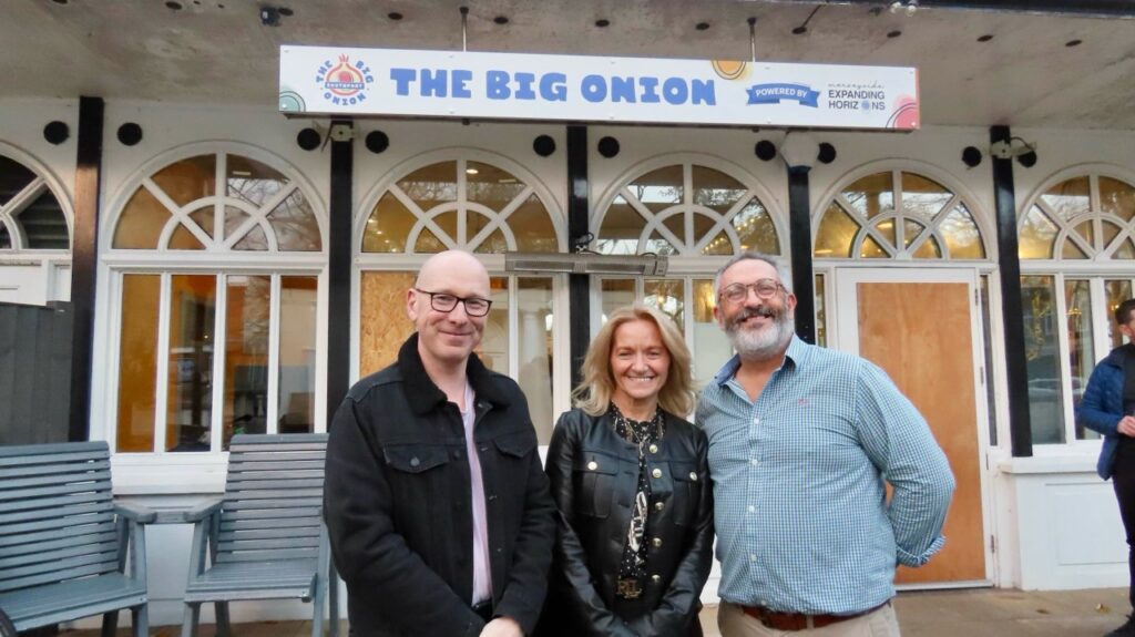 A large crowd of well-wishers and supporters enjoyed the soft launch of The Big Onion in the Town Hall Gardens in Southport. Southport MP Patrick Hurley, Nicola Daley (Merseyside Expanding Horizons Chief Executive) and Chris Lewis (Big Onion founder). Photo by Andrew Brown Stand Up For Southport